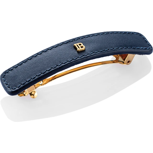 Featuring soft sapphire-blue napa leather with meticulous stitching and an 18K gold-plated "B" logo, the barrette combines high fashion with practical styling.
