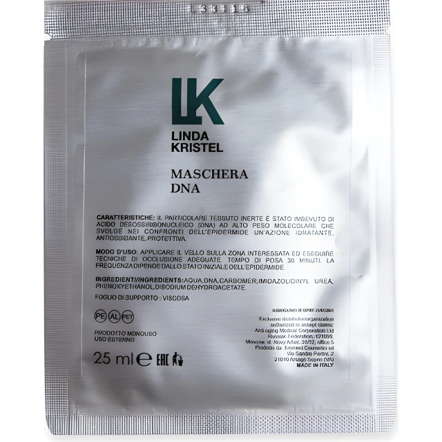 Maschera DNA is a professional-grade sheet mask designed for face and neck rejuvenation, featuring polynucleotides (DNA) as a key active ingredient. Manufactured in Italy, it is intended for all skin types to provide immediate lifting and anti-aging benefits.