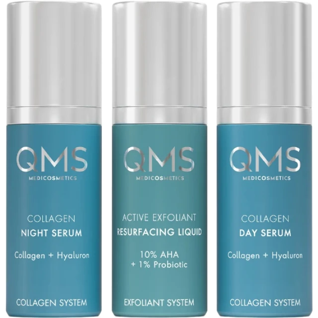 Core System Collagen + Exfoliant Set Strong by QMS Medicosmetics is a three-part skincare system designed to help improve skin appearance and promote a smoother, more radiant complexion. The set includes day serum, night serum, and exfoliant.
